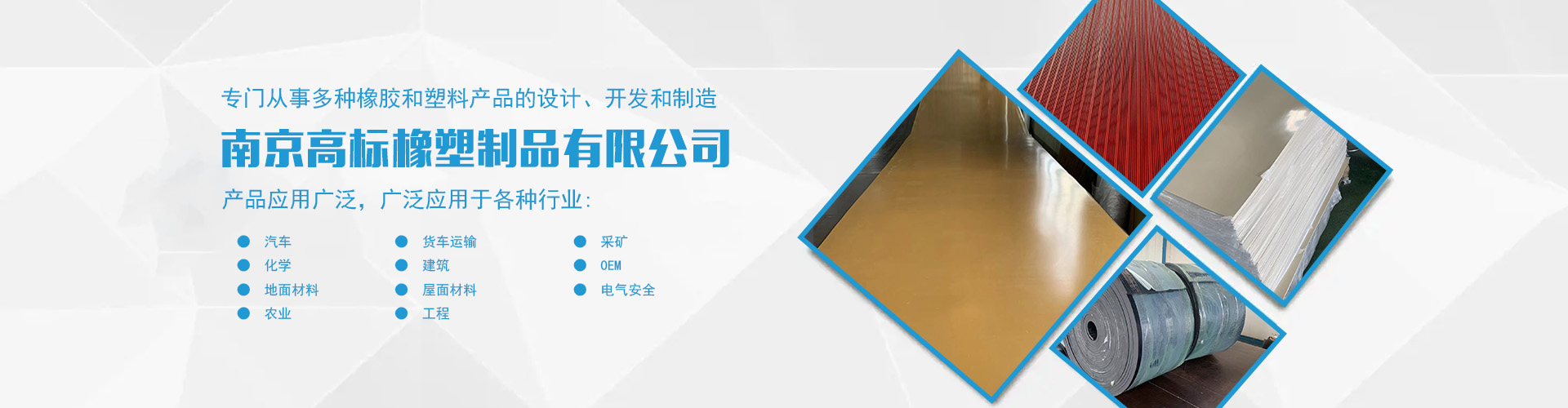 南京高標橡塑制品有限公司是一家專業的橡膠板、橡膠制品和熱塑性塑料產品的制造商。主營產品:三元乙丙橡膠板,丁腈橡膠版,氯丁橡膠板,丁苯橡膠板,丁基橡膠板,天然橡膠板,硅橡膠板,氟橡膠板,絕緣,防靜電,導電橡膠板,夾布,夾金屬網橡膠板,耐酸堿橡膠板,耐油橡膠板,耐磨橡膠板,阻燃橡膠板,阻尼橡膠板,減震橡膠板,防滑橡膠板,橡膠墊片等。 高標橡塑專門從事多種橡膠和塑料產品的設計、開發和制造。我們的產品應用廣泛。廣泛應用于各種行業,包括:汽車,貨車運輸,采礦,化學,建筑,OEM,地面材料,屋面材料,電氣安全,農業,工程等。 高標橡塑的客戶服務于許多行業,包括墊片切割、分銷商、工業用品零售商和批發商。自